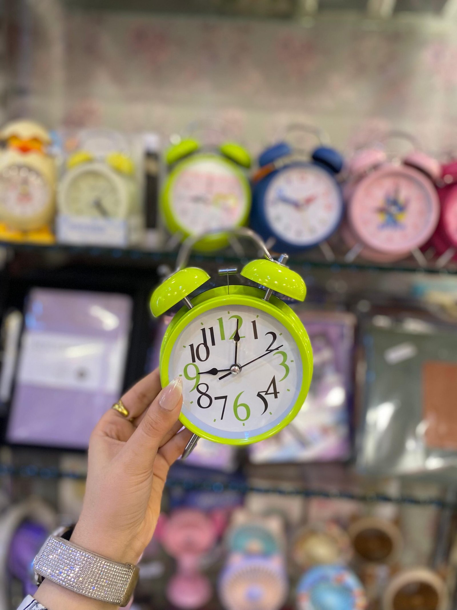 “منبه بلون اخضر فاتح هادي، بتصميم كلاسيك بسيط وأنيق، أرقامه واضحة وسهلة القراءة، مناسب لأي ديكور ويدي لمسة راقية وهادية للمكان.