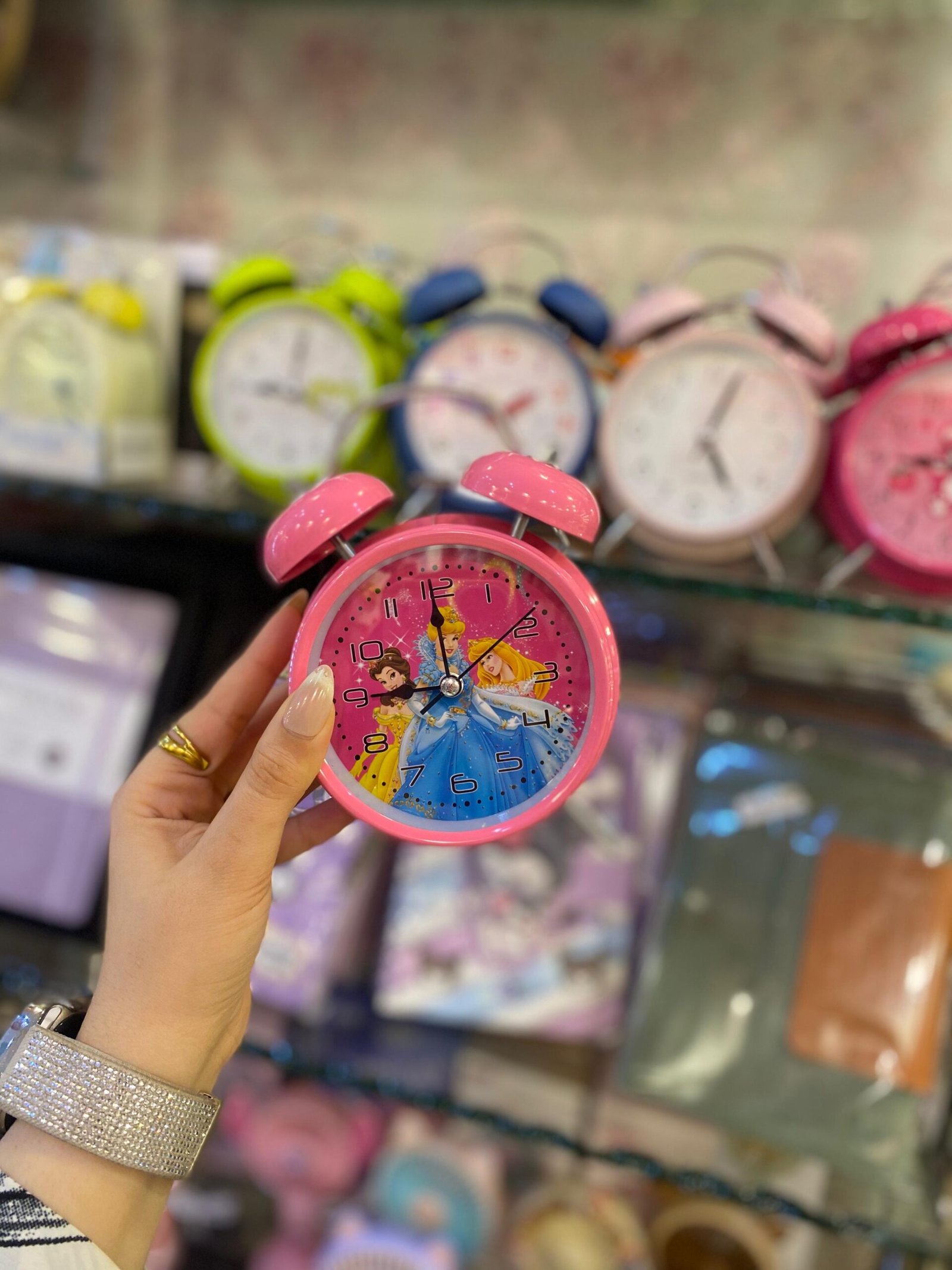 “منبه صغير بلون وردي كيوت، عليه رسومات لأميرات ديزني (سندريلا وبيل وسنو وايت)، تصميمه مبهج ومناسب لغرف البنات، وشكله شيك وناعم يدي لمسة لطيفة للمكان.”